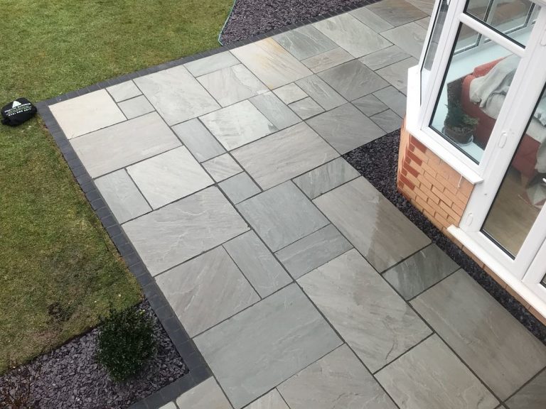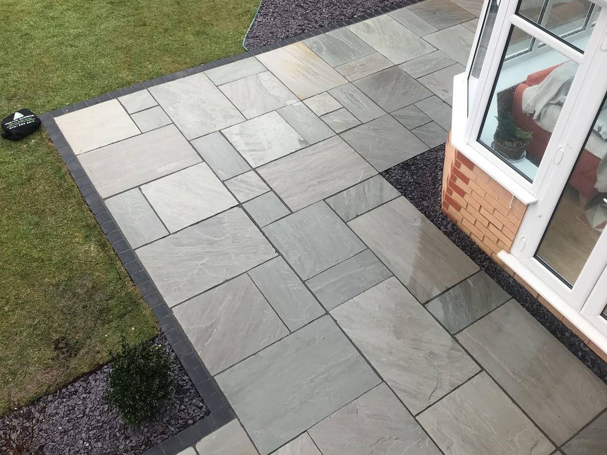 • RAJ GREEN Indian sandstone is our most popular patio paving colour, made up of a beautiful mix of subtle shades of warm grey, brown and autumnal shades.